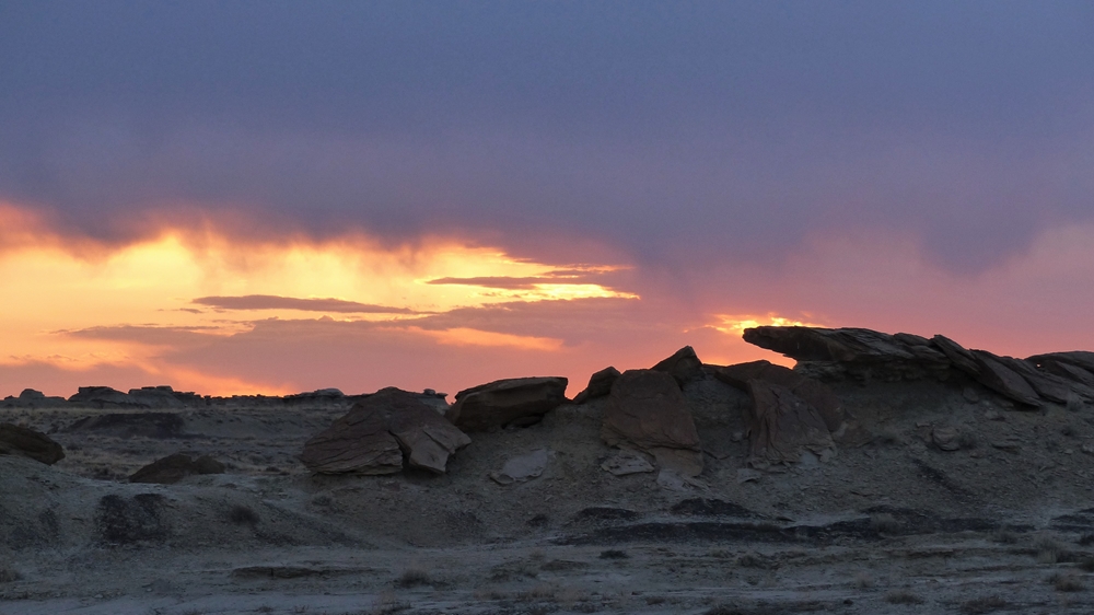 Als wir wieder am Womo sind, geht gerade de Sonne zwischen den dunklen Wolken unter und fuer einen kurzen Moment erscheint auch der Vollmond. Dann wird es schlagartig dunkel und die naechste Gewitterfront zieht an uns vorbei. Diesmal bekommen wir allerdings gefuehlt 20 Tropfen ab. Spaeter am Abend kommen noch 2 Autos. Es ist eine 6-Maenner-Gruppe aus Farmington. Sie wollen einen „full-moon-walk“ machen. Mit Taschenlampen, Wanderstoecken und dick eingepackt ziehen sie los, aber ohne full moon. Nach 1 Std. sind sie schon zurueck und fahren wieder weg.