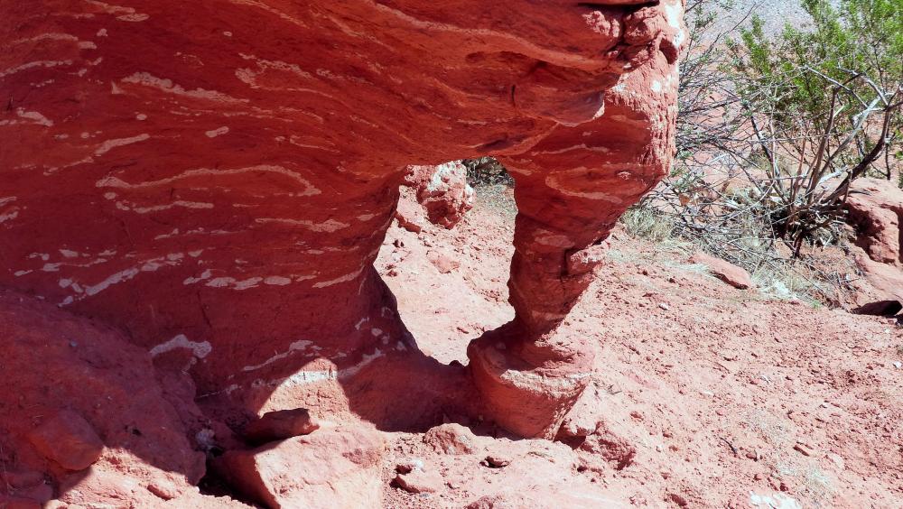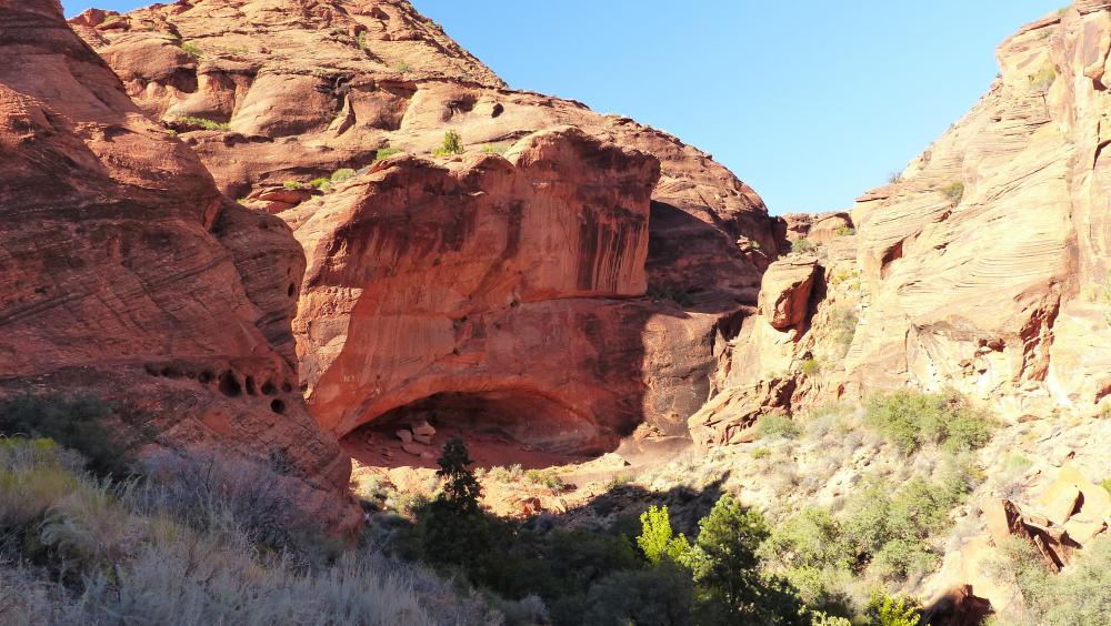 Der kleine CG liegt malerisch in dem kleinen Seitental, eine schoene Rote Steine-Gegend. Es ist mittags, ziemlich warm und wir koennen noch zwischen 3 sites aussuchen. Eine halbe Stunde spaeter sind alle sites belegt. Wir stehen sehr schoen am feuchten Gruenstreifen entlang des Creeks, die site ist sehr grosszuegig direkt an den roten Felswaenden gelegen (sogar mit eigenem Arch und Schildkroetenkopf) und wir haben einen grossen Shelter. Es sind fast nur Einheimische Familien unterwegs, Sonntagsausflug zum Grillen am schattigen Creek.