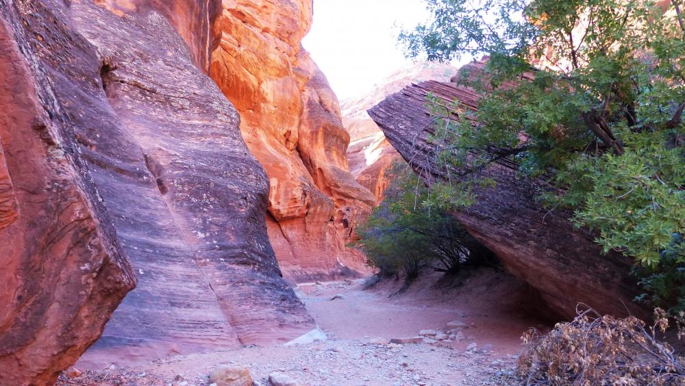 Zur Abkuehlung gibt es einen eiskalten Gin-Tonic und einen Snack. Spaeter, als die Sonne etwas tiefer steht, machen wir uns auf zum Water Canyon. Der Trailhead ist direkt am CG und fuehrt sehr schoen ins Tal hinauf. Die Nachmittagssonne laesst die Felsen orange-rot gluehen und im inzwischen schattigen Tal ist es schoen frisch.