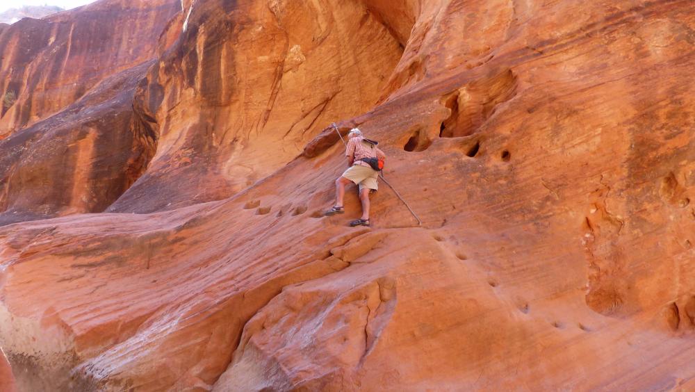 Dann kommt die interessante Kletterstelle mit dem Seil. Ich war ja schon sehr gespannt. Leider ist von Water in diesem Canyon kaum noch eine Spur, nur ein trockenes, ausgewaschenes Flussbett finden wir vor. Die besagte Stelle, an der man die Felswand mit Hilfe des Seil bezwingen kann wird fuer mich wieder zum Fiasko. Das grosse Wasserloch am Fusse der Felswand ist sehr tief und dunkel, ein abgestandener, dunkler und stinkender Tuempel. Nicht wirklich die „nasse Rettung“ wenn es ander Felswand „schief“ geht. Bis zur Mitte schaffe ich die Tritte. Dann, trotz Seil merke ich sofort: wenn ich jetzt weiterkomme habe ich es zwar geschafft, aber wie komme ich dann wieder zurueck? Das geht garnicht.
