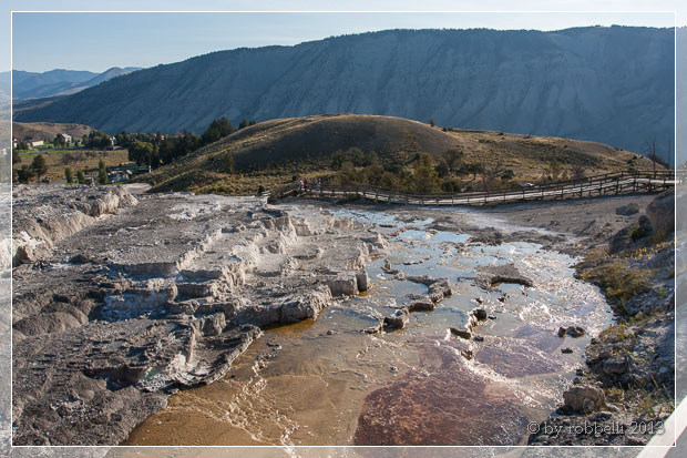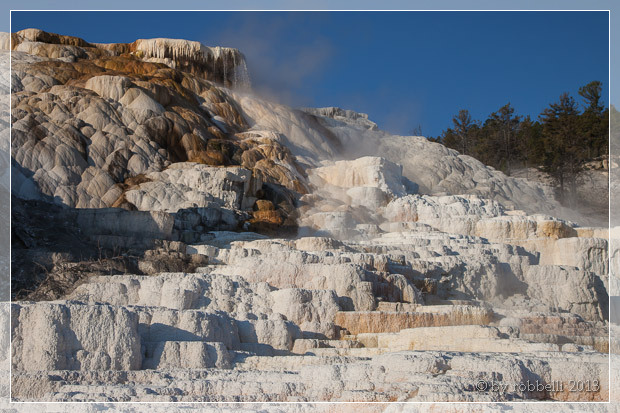 Ich schau mir mit Robert zuerst die Liberty Cap, dann die unteren Terrassen an, die gerade in ganz schönem weichem Morgenlicht erstrahlen.