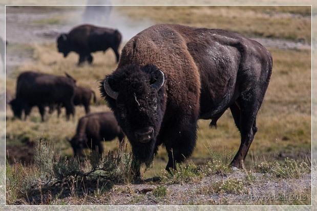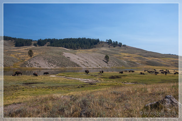 Wir durchqueren das Hayden Valley und sehen etliche Bisonherden. Wow, was für ein Anblick!
