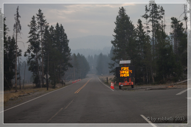 Mehr oder weniger dichter Qualm begleitet uns auf der ganzen Strecke bis Fishing Bridge. Dann biegen wir ab nach Osten, fahren am Yellowstone Lake entlang und von den Bränden ist nichts mehr zu sehen oder riechen.