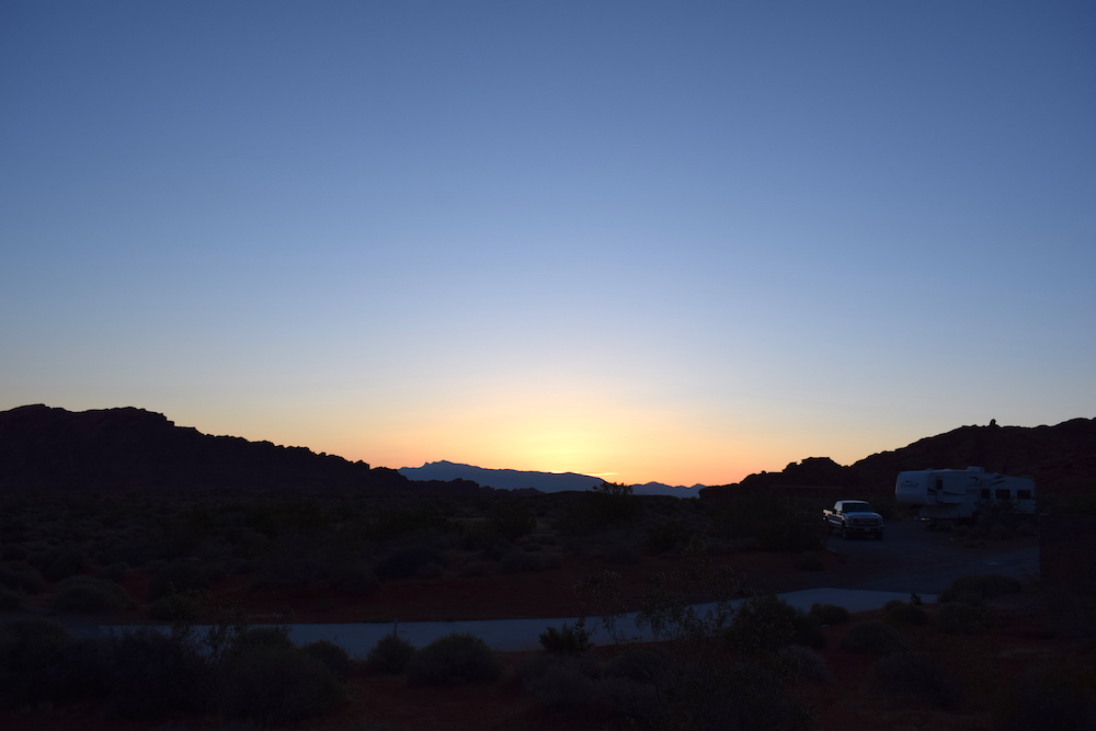 Um 23.00 Uhr waren wir zurück im WoMo. Alles zu Fuss hin und zurück. Unsere Füsse waren platt und wir wollten nur noch schlafen. Nachts kühlte es so fest ab, dass ich sogar die Klimaanlage abschalten konnte. Meine Frau und ich lagen beide im Bett um zu schlafen. Die Dachfenster haben wir geöffnet um ein bisschen kühle Luft ins WoMo zu lassen. Da stellten wir fest, dass die Vögel hier in Las Vegas wohl nie Nacht haben und fröhlich zwitscherten. Kein Wunder, Las Vegas war ja auch nachts taghell beleuchtet. Plötzlich hörten wir Polizeisirenen. Diesmal aber nicht von einem Polizeiauto oder Krankenwagen, sondern irgendein Vogel der genauso zwitscherte. Irgendwann fanden dann auch wir den Schlaf.