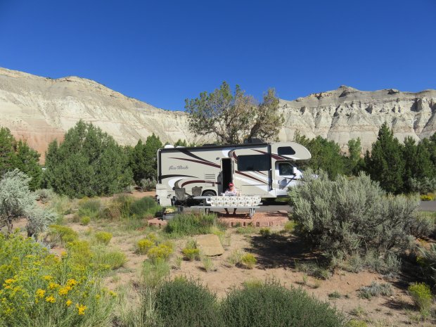 Es war wieder eine kühle Nacht mit Minus Temperatur. Wir hatten gestern Abend noch besprochen, ob wir heute vor dem Weiterfahren noch zum Rainbow Point wollen, oder direkt weiter zum Kodachrome Basin. Wir entschieden uns dann für`s weiterfahren, weil wir im Kodachrome Basin keinen Platz reserviert hatten und wir doch gerne dort übernachten wollten. Im Nachhinein, zum Glück sind wir früh gefahren ,waren um 9.15 Uhr beim Park Eingang und bekamen noch als letzte die Site 31. Da hatten wir wirklich Glück, beim nachfolgenden Womo hiess es schon sorry we are full. Nachdem wir eingeparkt hatten haben wir draußen in Ruhe ein richtig ausgiebiges Frühstück genossen.