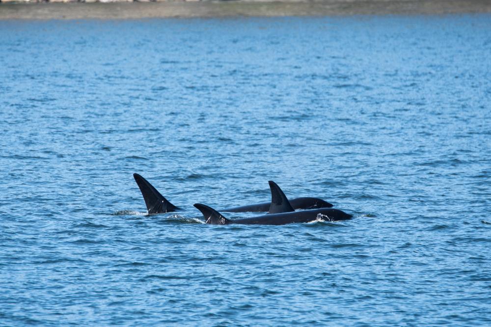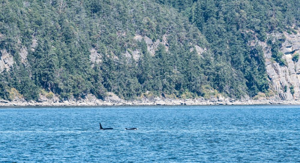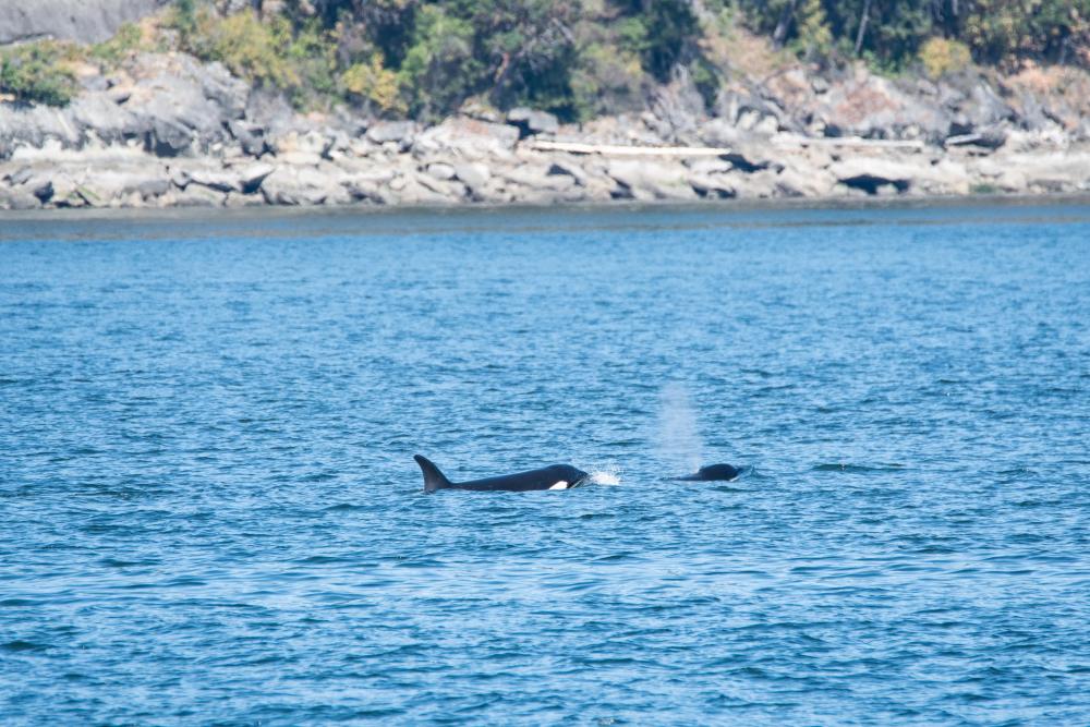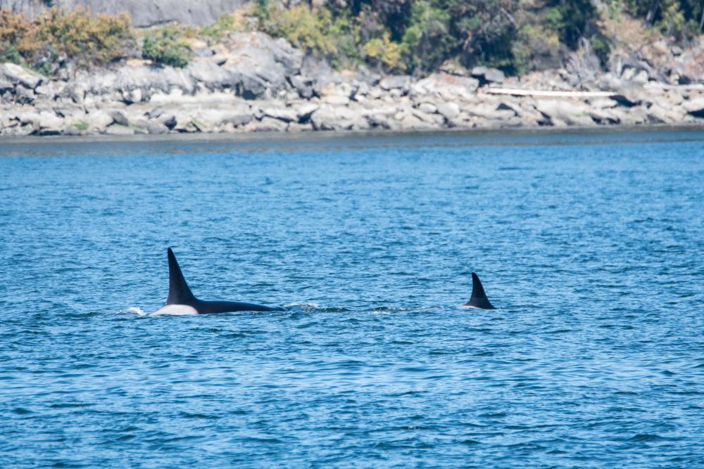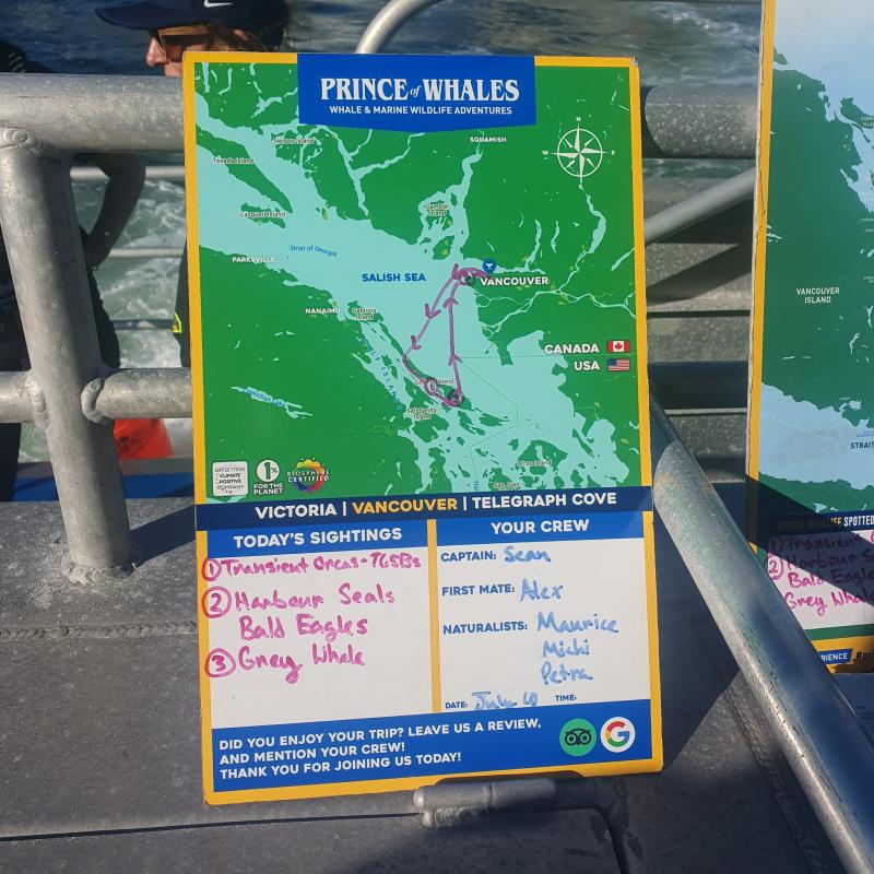 Beim Einsteigen mussten wir unsere Namen nennen und konnten einsteigen. Wir wählten eine Sitzgruppe draussen auf dem Aussendeck (oben). Bald darauf legte das Schiff ab. Wir mussten einige Zeit fahren, wurden aber plötzlich langsamer. Und da waren sie. Wir konnten 3 Orcas beobachten. Es war eine Mama mit ihren beiden Jungen. Hier einige Fotos.
