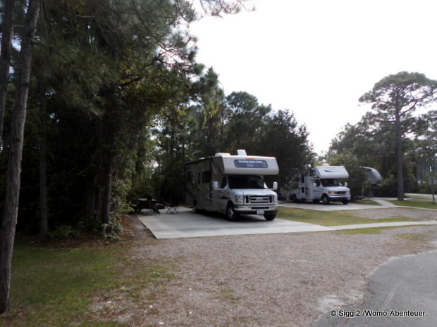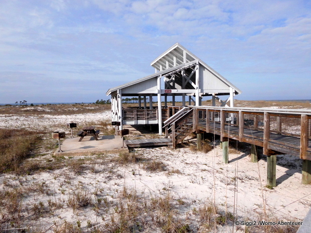Die Strecke war mit nur rund 120 Meilen wesentlich kürzer bis zum Dr. Julian G. Bruce St. George Island State Park. In Pensacola füllen wir im Walmart erst mal unsere Vorräte auf und schauen nach Grillzutaten für ein erstes abendliches Lagerfeuer. Florida ist offensichtlich der Staat der Brücken. Es sind beeindruckende Bauwerke, über die wir die Insel erreichen. Der Stellplatz ist wunderschön. Aber noch viel schöner ist der rot gefiederte Gast, der die Reste des Eierkuchens nascht.