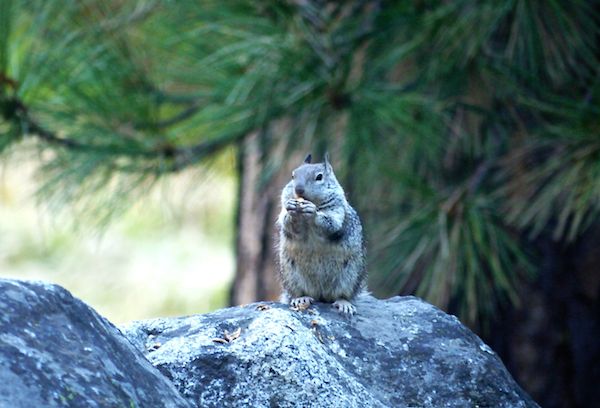 Zurück im Village haben wir uns am Curry Village bei einem Kaffee in der Sonne noch etwas aufgewärmt. Dabei konnten wir einem Squirrel und einem Raben bei ihren Versuchen, etwas zu Naschen abzubekommen, zusehen.