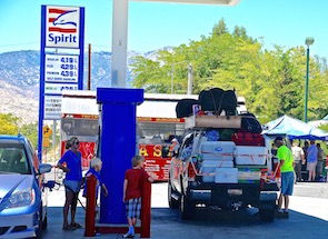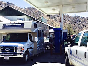 Nachdem wir den Lake Isabella passiert hatten, erreichten wir wenig später Kernville. Ein kleines Städtchen, was aber jetzt zur Mittagszeit rappelvoll war. Viele Einheimische waren am Wochenende unterwegs, um sich in den etwas kühleren Bergen zu erholen. Da wir morgen in den Sequoia NP wollten, haben wir unser WoMo nochmal voll getankt. Das war die mit Abstand engste Tankstelle, auch weil die Fahrzeuge so kreuz und quer Stunden, dass kaum ein Durchkommen war. Man könnte meinen, ab morgen gibt es keinen Sprit mehr. Wir hatten Zeit und ließen uns nicht stressen.