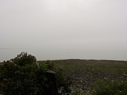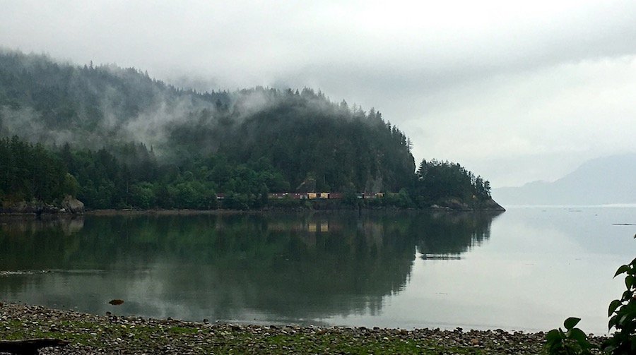 Bei dem Wetter war leider nichts von der sicher schönen Umgebung zu sehen. Daher haben wir uns auch nicht mehr lange aufgehalten und uns auf den Weg gemacht. Dann hörten wir aber das laute Signal einer Lok und sahen zumindest noch den ewig langen Zug, der sich am Ufer entlang schlängelte. Den konnten wir nur erkennen, weil sich der Dunst so langsam auflöste. Trotzdem hing alles ringsum weiter in dicken grauen Wolken.
