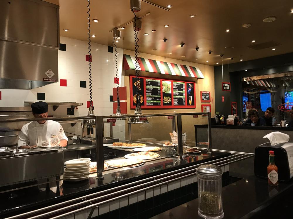 Am Abend besuchen wir die "Mystere" Show von Cirque du Soleil. Die ist laut Recherche für kleinere Kinder am besten geeignet. Die Show ist im Treasure Island. nachdem wir geparkt haben essen wir schräg gegenüber des Show Eingangs eine Pizza. Nicht super, aber ok und einfach praktisch.