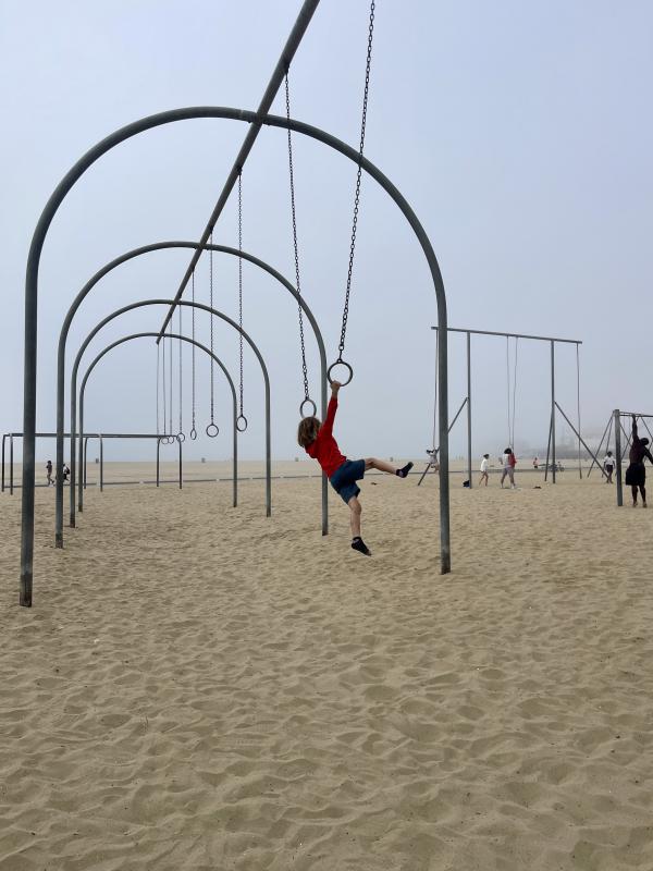Wir sind guter Dinge und mieten uns als erstes gleich Fahrräder. Top ausgerüstet, fahren wir runter an den Strand. Bbbrrr.. es ist ziemlich kalt im Nebel und wir ärgern uns, dass wir keine Jacken dabei haben. Die Kids möchten sofort die Sportgeräte am Strand ausprobieren; also machen wir hier gleich unseren ersten Stopp.
