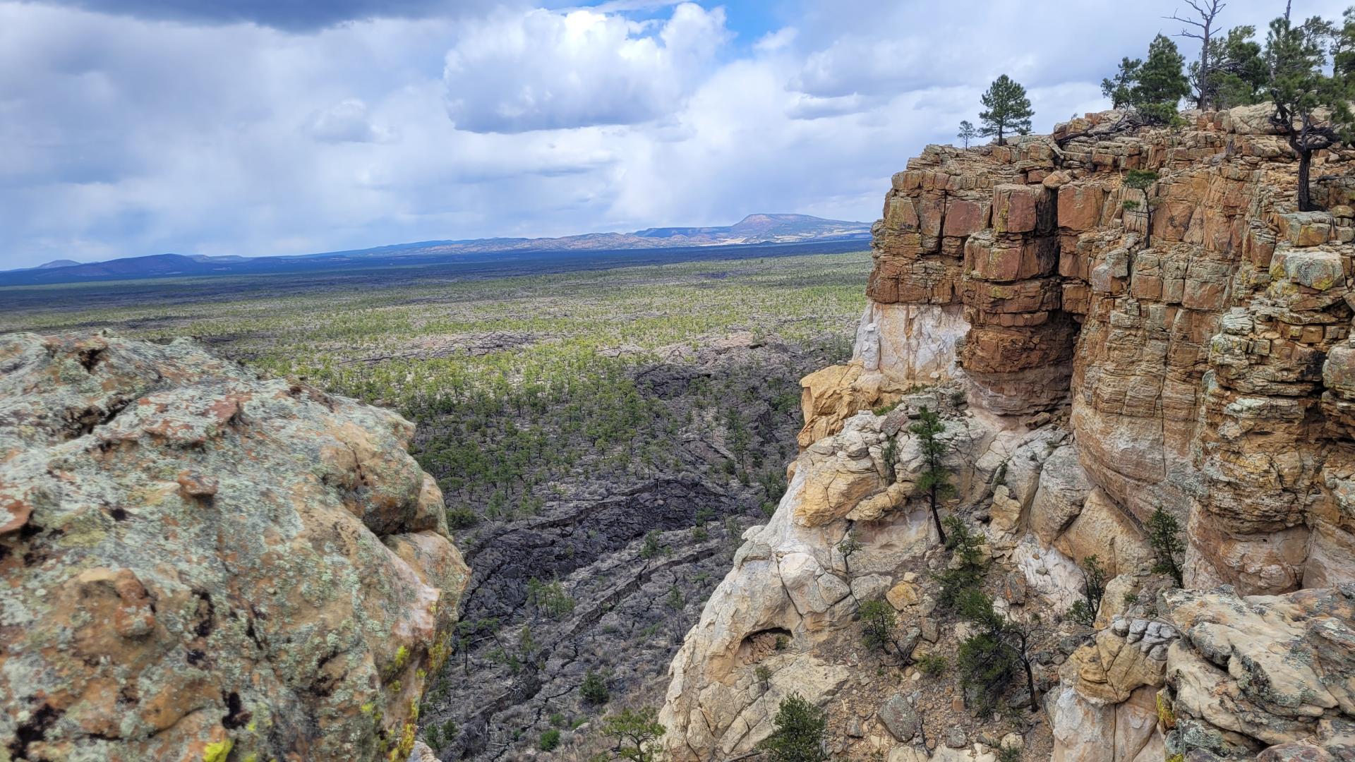 Mo, 24.04.2023 El Malpais NM Joe Skeen BLM CG  Fahren morgens zum Lava Falls TH, laufen den Loop zu einer Bowl. Dann suchen wir die Boondockingplätze, nicht schön. Laufen dann den Narrow Rim Trail ab Picnic Area. Später Stopp am La Ventana Natural Arch. Den ganze Tag war es sehr stürmisch. Trotzdem Feuer. 41 (nur Jeep)