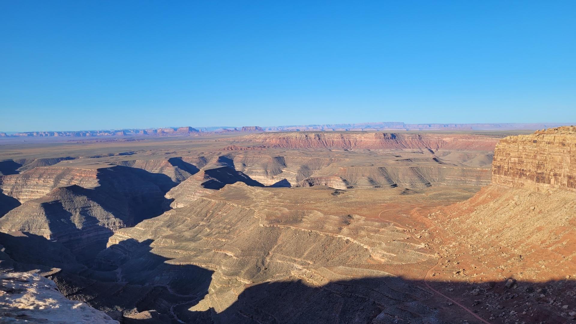 Fr, 28.04.2023 Muley Point  Boondocking am 1. Aussichtspunkt Laufen früh ans Ende des SP, noch viele tolle Boondockingplätze. Moki Dugway (tolle Ausblicke), gut zu fahren. Dann Muley Point Road, parken Trailer am 1. Aussichtspunkt, mit Jeep zum 2.. Uns gefällt der 1. besser, laufen da noch länger am Rim lang. 16 3(Jeep)