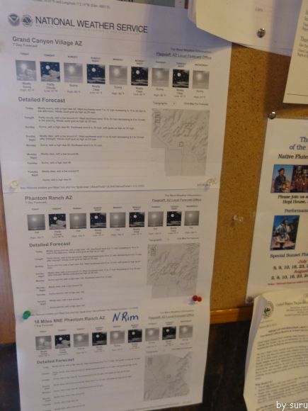 Nach einer Mittagspause fahren wir mit dem Shuttle zur Bright Angel Lodge. Da erhalten wir eine Bestätigung unserer gebuchten Mahlzeiten auf der Phantom Ranch, die telefonische Bestätigung reicht nicht aus. Außerdem checken wir den Wetterbericht, heiß soll es morgen werden.