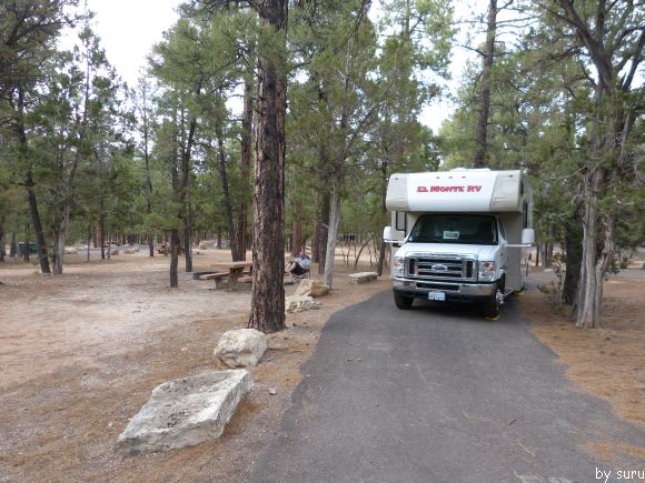 Ich habe Site 52 auf dem Mather CG für 3 Nächte vorgebucht. Während unserer Wanderung zum Bright Angel Campground soll das Wohnmobil dort stehen bleiben. Wir parken das Wohnmobil entgegen der Fahrtrichtung, damit die Tür auf der richtigen Seite zur Tisch-Bank Kombination ist. Da habe ich doch tatsächlich beim Reservieren nicht darauf geachtet, die Tür sollte immer rechts zur Fahrtrichtung sein. Das Wohnmobil verkehrt herum zu parken ist nicht erlaubt, wir haben den entsprechenden Hinweis nach unserer Wanderung an der Windschutzscheibe.