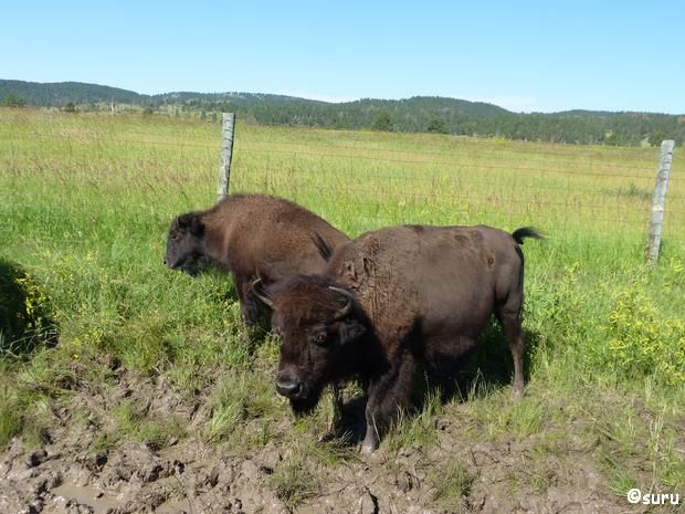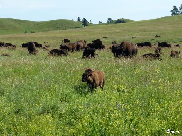 Da wir den Wildlife Loop (18 mils Loop von Game Lodge zu Blue Bell Lodge) fahren wollen, lassen wir das Frühstück zunächst ausfallen und fahren um kurz nach 8 Uhr los. Direkt zu Beginn versperren uns Bisons den Weg. Mit Kälbern, wir haben Zeit und beobachten sie eine Weile.