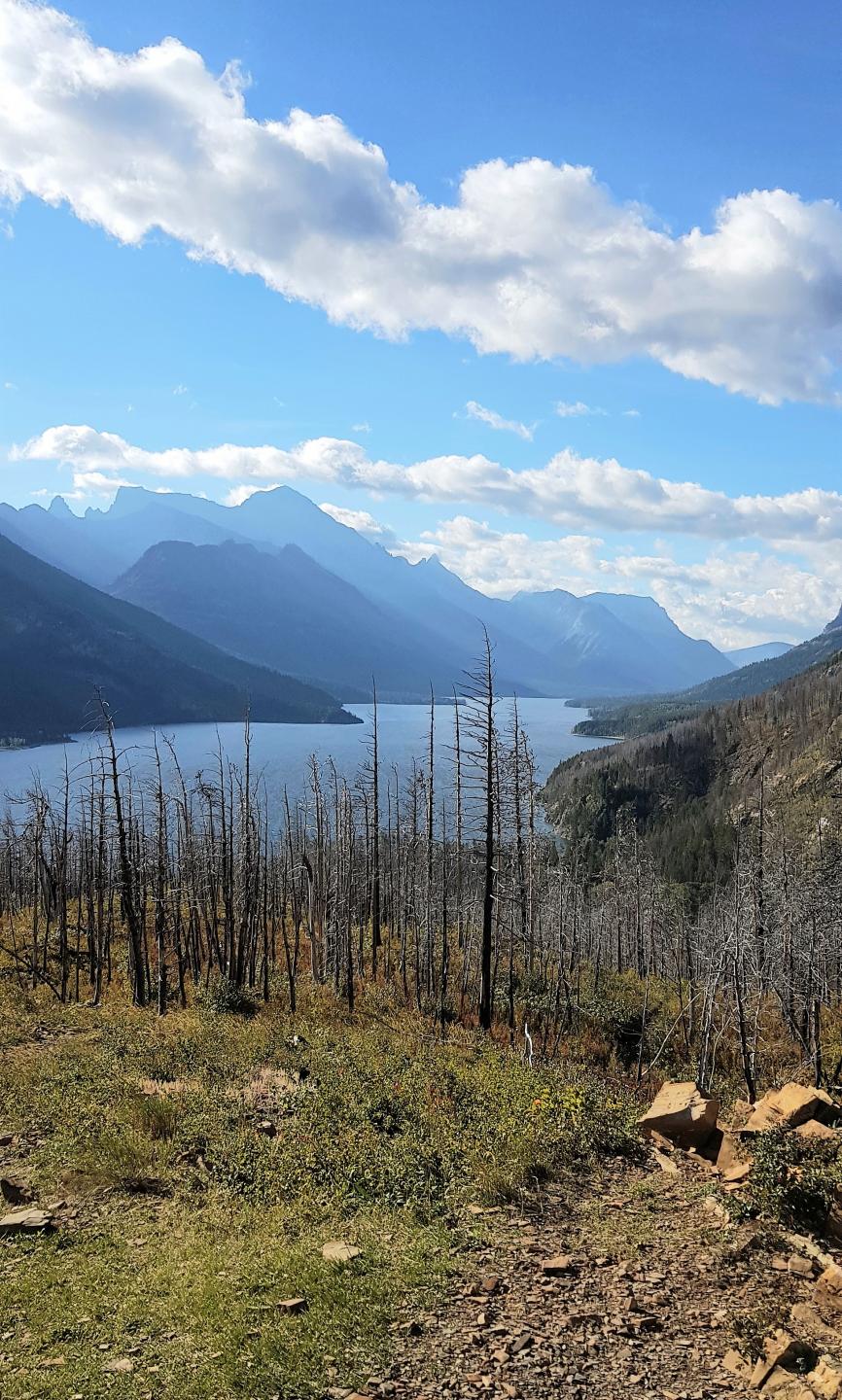 Schon der Beginn der Strecke gefällt uns ausgesprochen gut, immer mit Blick auf den Upper Waterton Lake. Hier sieht man die Auswirkungen des Brandes von 2017, überall abgebrannte Bäume. Uns stört es nicht, wir mögen die durch den Brand wieder möglich gewordenen Ausblicke auf den Waterton Lake. Zwischendurch treffen wir mal wieder Deers, mitten auf dem Wanderweg. Leider sind die Kamera und das Handy noch im Rucksack.
