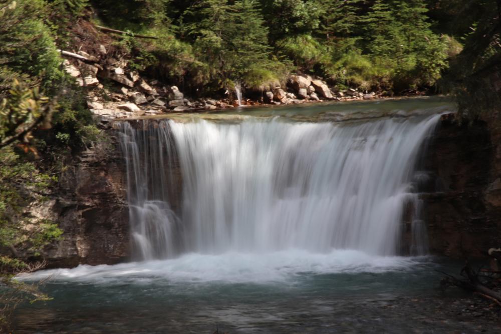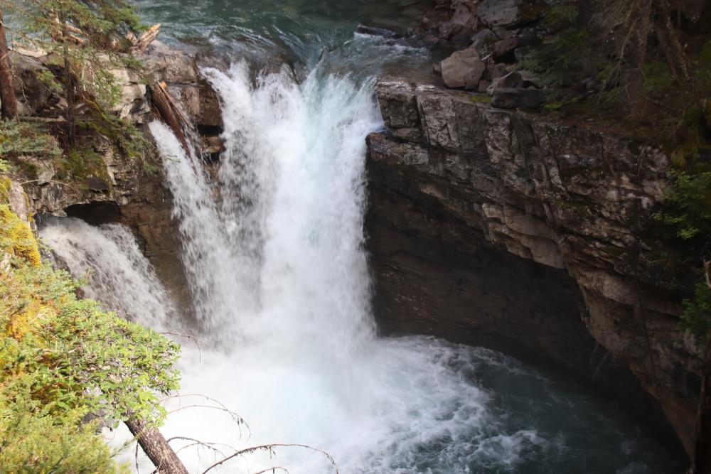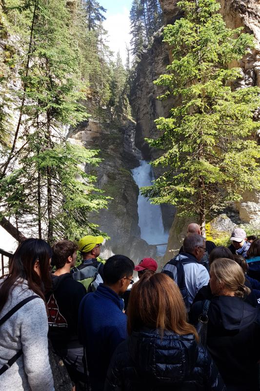 Für heute wollen wir auf dem Weg die Wasserfälle am Johnston Canyon sehen. Also über den Bow Valley Parkway hin. Puh, hier sind aber viele Autos und die stehen schon am Rand des Highways. Wusste gar nicht, dass das hier so ein Hotspot ist. Gefühlt parken wir 1km den Highway runter vom Trailhead entfernt. Auf dem Weg die Schlucht hoch gilt dann: Willkommen beim Volkswsandertag! In einer langen Schlange geht es bergan. Das ist ja schlimmer als am Lake Louise oder Peyto Lake. Mir fällt es schwer die tolle Landschaft zu genießen. Oberhalb der Lower Falls wird es ein wenig besser, aber nicht wirklich leer. Ach ja, das Anstellen, um durch den Felsdurchlass auf den Wasserfall zu gucken, schenken wir uns! Auch der Upper Fall beeindruckt uns, auch wenn wir hier auch nicht wirklich alleine sind.