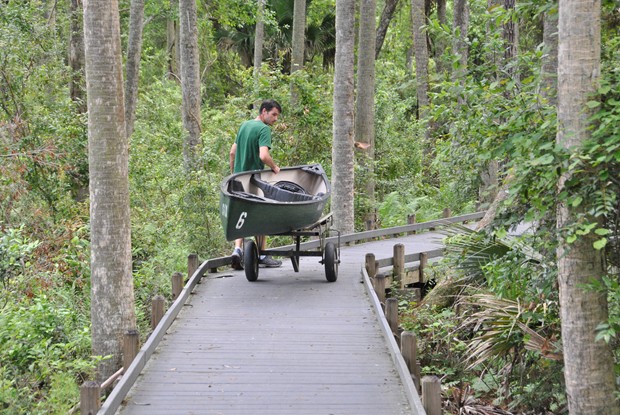 Die Kanus fährt man über einen Plankenweg zu einer Anlegestelle am Fluß. Dort sitzt eine Rangerin und kontrolliert ob man auch keine Wegwerf-Plastikflaschen dabei hat und gibt Infos mit auf den Weg. Der Wasserstand war im Augenblick extrem niedrig. Ich habe keine Ahnung wie der junge Mann dort paddeln will. Er wird sein Kanu wohl oft tragen müssen.