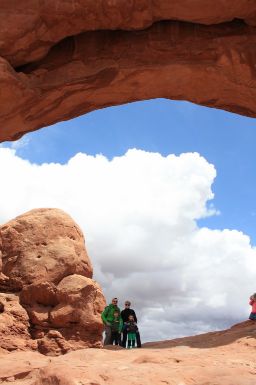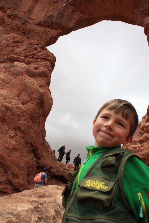 Nach einer verregenten Nacht fliehen wir am 22.05. aus dem Canyonlands NP und fahren nach Moab. Erstmal ist dann im Arches NP Warten am Eingang und auch im Visitor Center angesagt. Irgendwie sind viele Leute gereizt, selbst die stets freundlichen Ranger wirken genervt. Wir entscheiden uns mit den Jungs zur Windows Sektion zu fahren. Und wie überall im Park heißt es warten, bis sich die Schlange der Autos und RV's durch die Parking Lot gequält hat. Zum Glück finden wir einen Stellplatz für unseren Dicken und können uns die tollen Arches hier anschauen. Wir "Großen" kennen den Park schon, die Jungs finden die Steinbögen toll, besonders, dass sie viel herum klettern können. Unser Fazit: wenn man im Arches NP einen Platz auf dem Devils Garden CG ergattert (dieses Glück hatten wir leider nicht, wir waren beim Reservieren ein paar Tage zu spät nach dem Öffnen des Buchungsfensters dran), kann man diesen eigentlich schönen NP besser genießen. Uns war es hier einfach zu voll (war 2011 nicht so schlimm), und das liebe Wetter spielt auch hier nicht mit, so dass wir ins WoMo flüchten müssen. Nachdem unsere Jungs auch hier den Eid der Junior Ranger abgeleistet haben, machen wir uns auf die Suche nach einem CG für die Nacht. Obwohl es Mittwoch ist, sind verdammt viele RV-Parks full, so dass wir doch zu unserem ursprünglichen Plan zurückkehren und in die Sand Flats Recreation Area fahren. Bevor es mal wieder zu schütten anfängt, können wir noch grillen. Nach dem Regenguss laufen wir noch ein paar Meter und unterhalten uns mit einer Schweizer Familie, die zu viert in einem ExplorerVan schon seit fast 5 Wochen unterwegs ist.