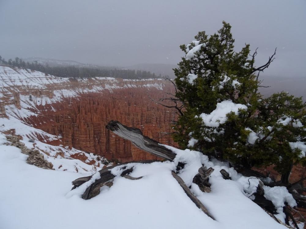 Die Nacht über hat es geregnet und sich merklich abgekühlt. Heute bin ich (Mareen) mal mit Fahren dran. In Cannonville füllen wir unseren Propantank auf. Der nette Herr vom KOA berichtet uns schon, dass es im Bryce Canyon regent und scheien soll. Aber von Schneeregen fehlt hier jede Spur: es ist kalt und schneit in dicken Flocken. Die Jungs wollen kaum das Womo verlassen. Der Sunset Campground ist geschlossen. Das ist aber weiter kein Problem, weil es nicht allzu viele Verrückte gibt, die bei diesem Wetter einen Stellpaltz auf dem North CG suchen.