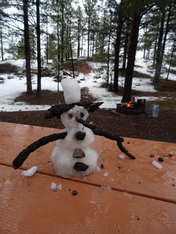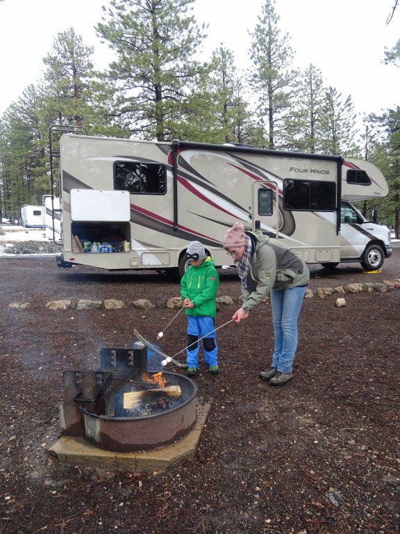 ). Felix nutzt die Zeit und hält ein kleines Nachmittagsschläfchen. Da wir bei diesem Wetter nicht hiken können, fahren wir mit dem Shuttle bis zum Inspiration Point und laufen am Rim bis zum Sunset Point. Dabei schneit es mal wieder oder immer noch. Am Campground gibt es trotz des Wetters ein kleines Lagerfeuer und wir bauen einen Mini-Schneemann, der von unseren Jungs noch liebevoll mit Schneewällen geschützt wird. Als Rene die gekaufte Hühnersuppe öffnet, entpuppt sich diese als Hühnerfond. Zum Glück haben wir Möhren, Wiener und Nudeln an Bord, so dass wir einfach unsere eigene Suppe kreieren. Und was soll ich sagen: sie war lecker und so schön warm.
