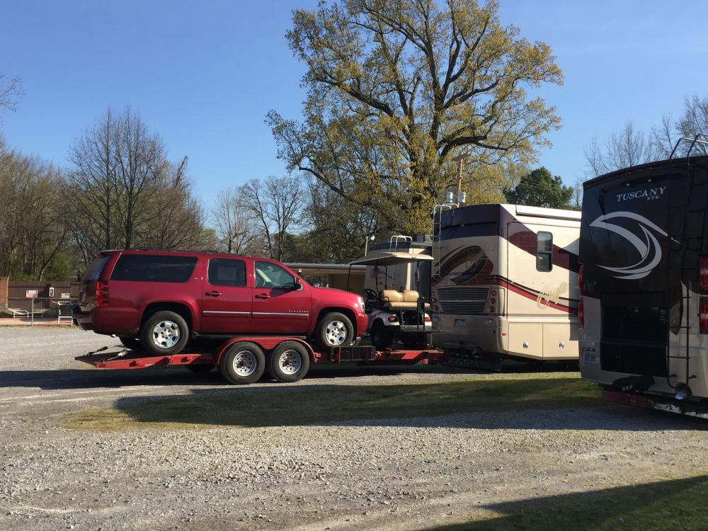 Ach ja, eine Anekdote gibt es noch. Auf dem Campground standen Wohnmobile, also ich meine richtige Wohnmobile, American style, nicht diese Sardinendosen, die als Mietfahrzeuge an Touristen gegeben werden. Auf dem Anhänger dieses Exemplars war dann neben dem SUV auf das Golf Cart geparkt.