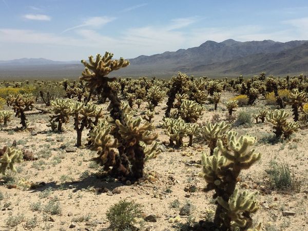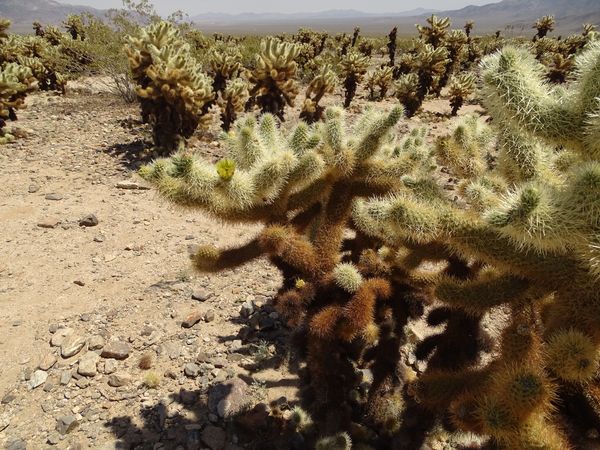 Doch nun wird es Zeit, direkt in den Park zu fahren. Zunächst begeben wir uns zum Visitor Center in Twentynine Palms. Wie immer werden wir von einer netten Rangerin mit umfangreichen Informationen und einem Vorschlag für eine Tour versorgt. Und so fahren wir zunächst durch den Wilson Canyon zum Cholla Cactus Garden, wo die Kakteen um diese Jahreszeit noch blühen.