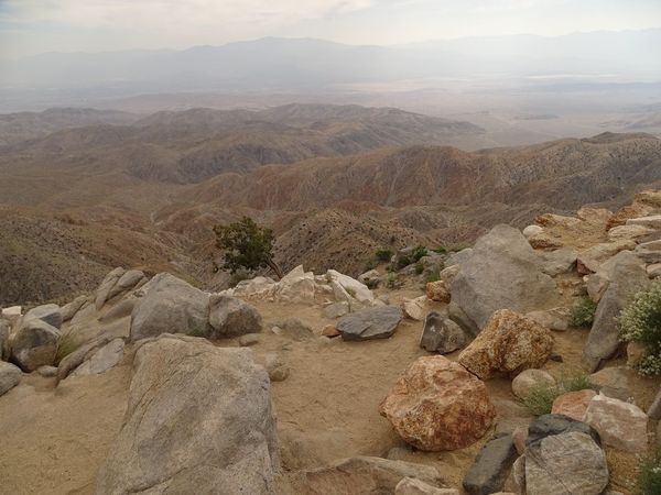 Nachdem wir hier einige Zeit verbracht haben, fahren wir weiter zum Keys View, einem auf fast 1.600 Höhenmeter liegenden Aussichtspunkt, von dem man auf das fast auf Sealevel liegende Palm Springs hinunter sehen könnte, wenn es nicht so diesig wäre. Dafür ergibt sich ein schöner Blick auf die gegenüber liegenden San Jacinto Mountains, einem beliebten Ausflugziel südlich von Palm Springs. Die Gipfel dort sind noch schneebedeckt. Wäre sicher auch mal eine Anlaufstation bei einem künftigen Urlaub.