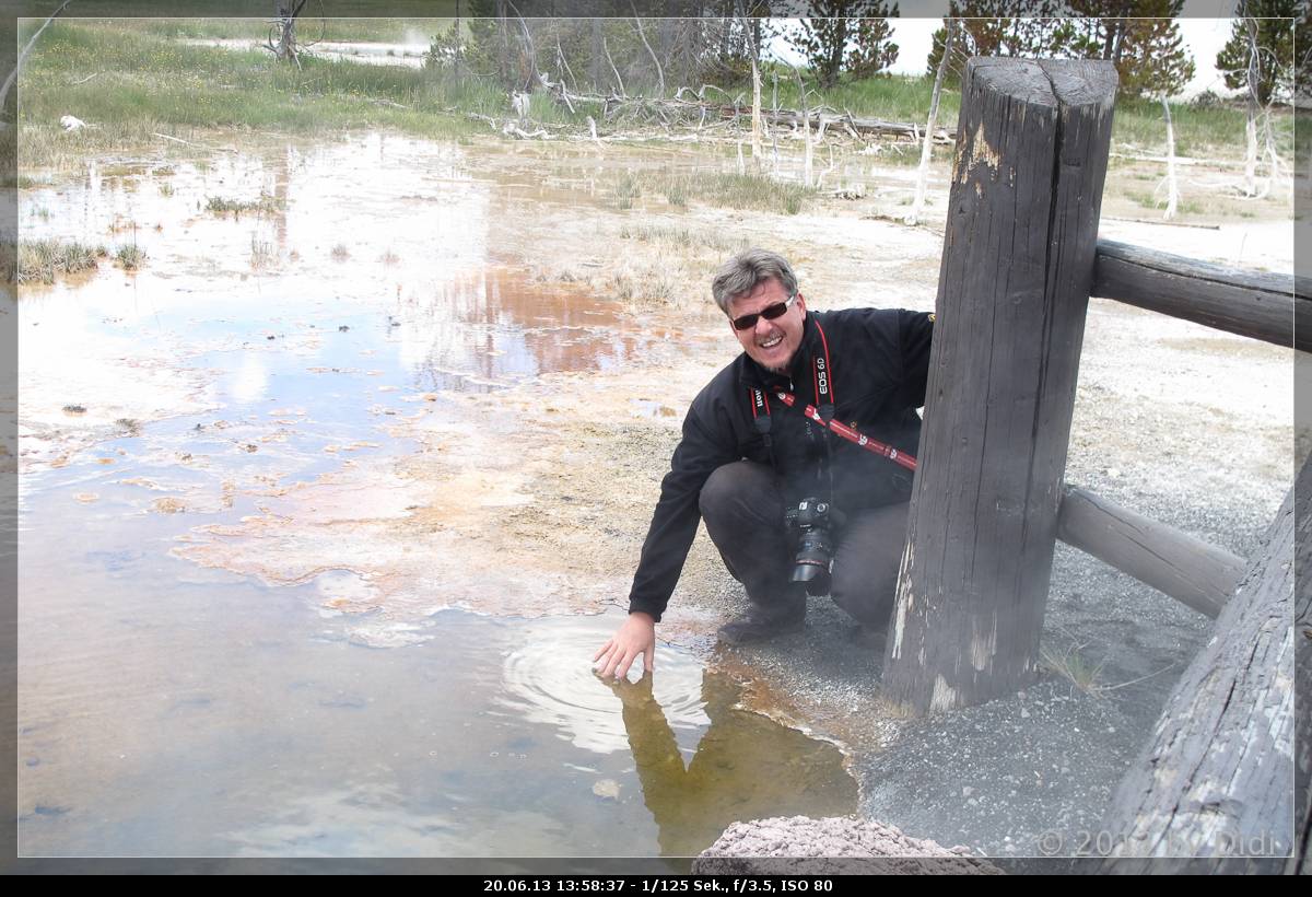 94°C, genau !! Unten drin liegen übrigens die Knochen eines Bison, der im Winter 1996 in diese Quelle gefallen ist und natürlich sofort tot war. Man sieht´s auf diesem Foto aber nicht.