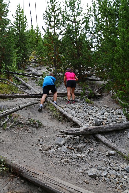Übrigens: um Fotos der Grand Prismatic Spring von oben zu machen, muss man ja einen der umliegenden Hügel hochklettern. Verbotsschilder stehen an einzelnen Aufgängen, an anderen allerdings nicht ! Entsprechend klettert auch in 2015 weiterhin "Gott und die Welt" da hoch, und wir natürlich auch. Das ist durchaus recht steil, wie man hier sehen kann, aber Ihr werdet sicher zustimmen, dass es sich gelohnt hat !