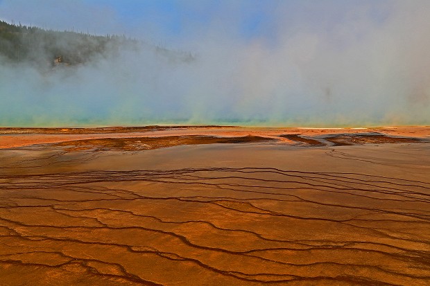 Die gelbe Zone der Grand Prismatic Spring wird im Winter schmäler, weil´s da weniger UV-Licht hat.
