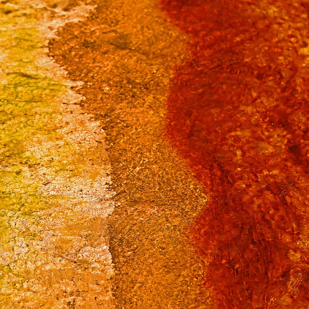 Es ist ziemlich unfassbar, dass selbst in 95°C heissem Wasser noch Lebewesen existieren können ! Und doch gibt es diese, es sind sogenannte thermophile Bakterien und sie haben den melodischen Namen Aquifex. Im Yellowstone findet sich Aquifex aeolicus. Diese Bakterien "essen" Wasserstoff, Sauerstoff, CO2, Mineralsalze - eben was gerade so da ist.