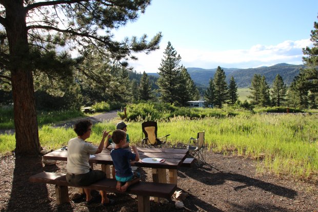 So haben wir uns nach einem schnellen Mittagessen zu Fuss auf den Weg gemacht. Leider kann man im Resort nur Boote ausleihen (Fischerboot 45 $ für einen halben Tag), keine ATVs. Darauf hätten wir mal Lust gehabt. Für den See sind wir nicht warm genug angezogenn, der Wind ist kalt. Wir sind ja auch auf 2500 m Höhe! Auf dem Rückweg zum CG kommen wir an einer Burger Barn vorbei. Hier holen wir uns schnell nochmal was zu essen. Am Eingang hängen Futterstationen für Koolibris! Die sind ja echt winzig, wenn die mal still stehen. Und richtig schön bunt. Klasse!