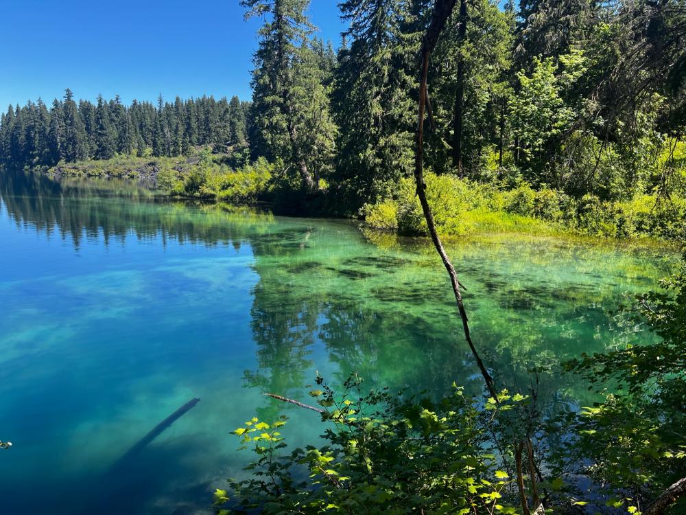 Nach 80 Minuten haben wir den Loop fast vollendet, aber irgendein wirrer Gedanke treibt uns weiter zum Clear Lake. Wären wir mal mit dem Womo dorthin gefahren! Der Weg zieht sich, immer kreuz und quer durch den Wald. Wir haben alle keine Lust mehr und sind von der Wärme (und der frühen Uhrzeit) k.o. Aber der See ist wirklich hübsch. Mehr als einen Blick gönnen wir uns nicht. Eigentlich war es nur ein Umweg von 40 Minuten, aber man sollte aufhören, wenn es schön ist.
