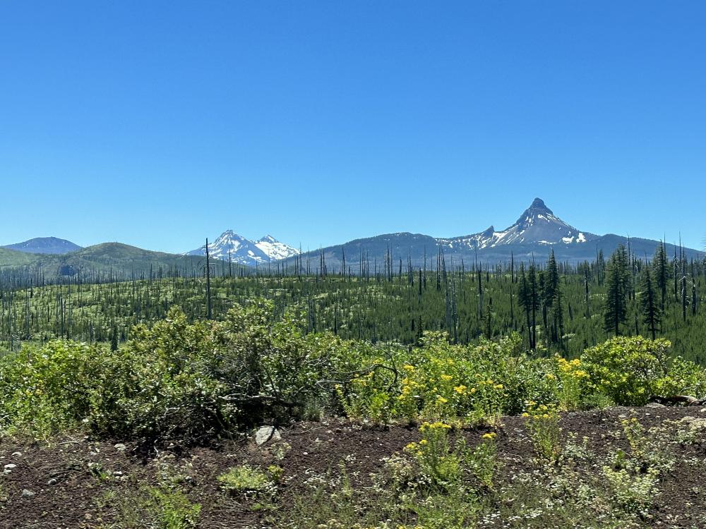 Gestärkt fahren wir vorbei an diversen Skigebieten nach Sisters, müssen tanken und mal wieder etwas einkaufen. Ich erstehe 2 aufblasbare Reifen für je 28 $, denn wir sind ja bald in Bend und können dort hoffentlich etwas floaten. Die Waldbrandgebiete von 2002/3 sehen gar nicht so lange her aus, aber hier ist die Wachstumszeit für Büsche und Bäume ja sehr kurz...