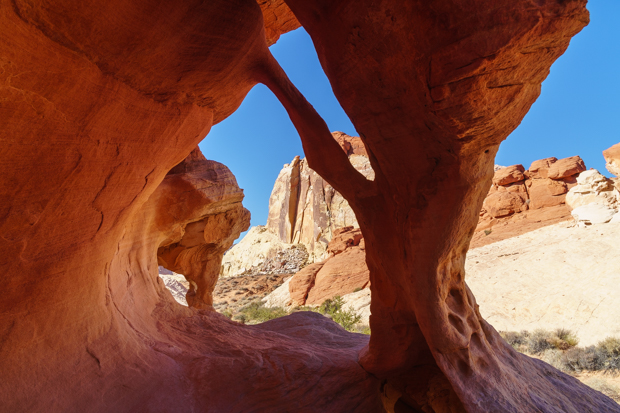Nachdem es nun doch immer wärmer wird, entscheiden wir uns nach etwa zwei Stunden für die Rückkehr zum Womo. Bei der Weiterfahrt stoppen wir noch kurz beim Elephant Rock, weil die Jungs diesen Arch noch angucken wollen. Anschliessend verlassen wir das wunderschöne Valley of Fire und fahren weiter nach St. George.