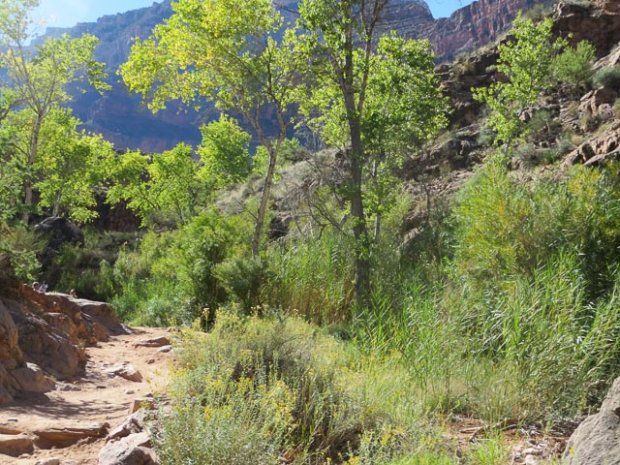Danach laufe ich ein Stück dem Colorado River entlang zum Bright Angel Trail. Der Weg führt bis Indian Gardens lediglich leicht steigend bergauf. Ich staune, wie grün das Tal hier ist. Da hatte ich mir eine viel kargere Landschaft vorgestellt.