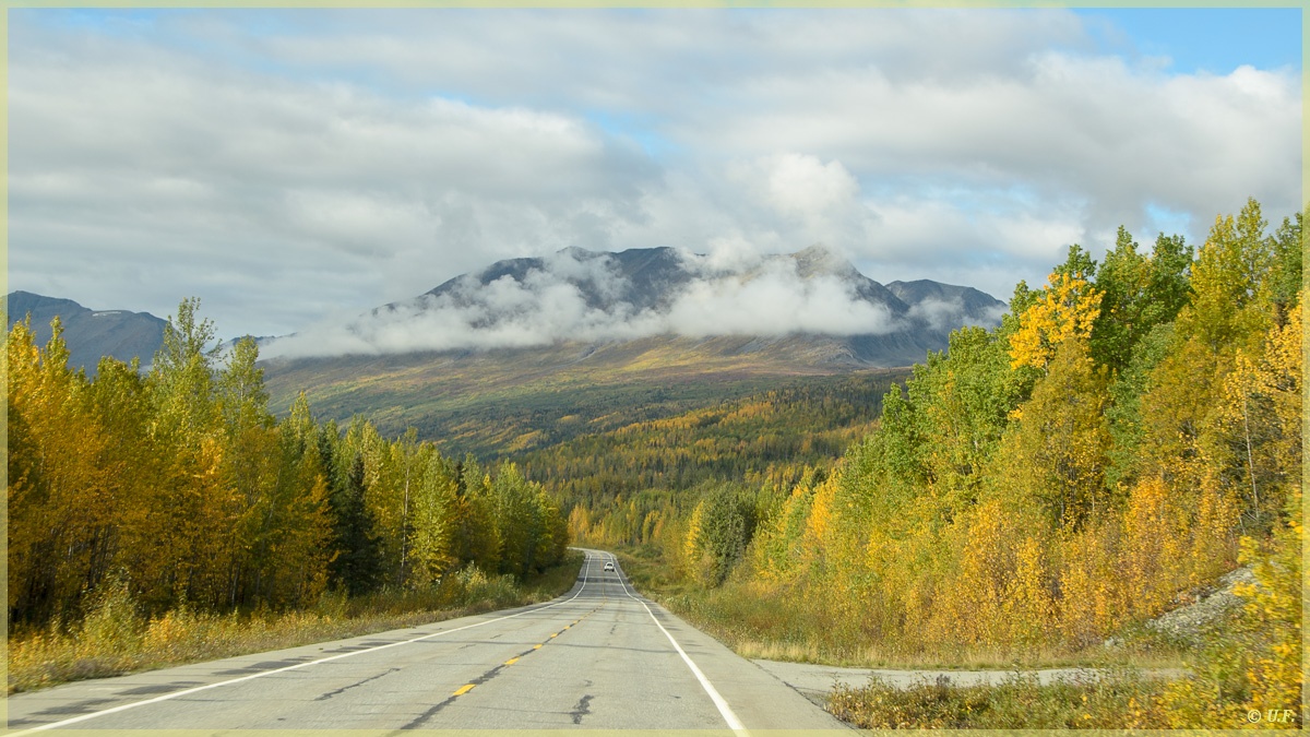 Und siehe da – mit jedem gefahrenen Kilometer wurde das Wetter besser und bald war der Himmel über weiter Teile blau und die Sonne ließ die Berge und gelben Bäume in wunderbarem Licht erscheinen. Das war wirklich ein toller Highway, und mal wieder richtig leer.