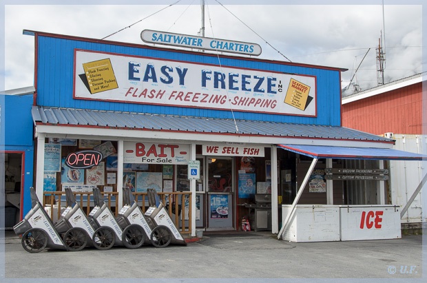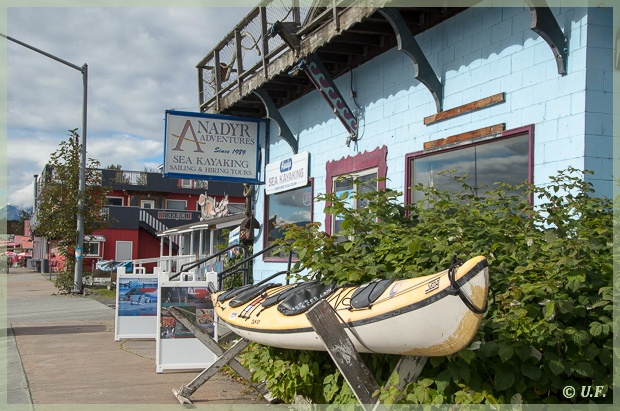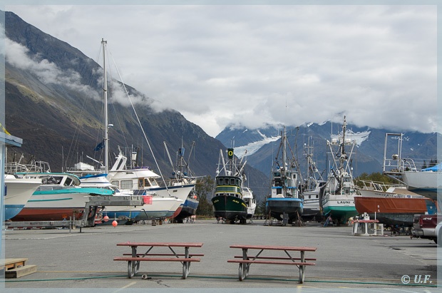 Gern hätten wir zum Mittag irgendwo ein Fischbrötchen oder auch Fish&Chips gegessen, aber es war einfach nichts zu finden. Also sind wir wieder zurück ins Womo und haben sind am Ortsausgang auf die Dayville Road eingebogen, eine Straße, die von der Milepost empfohlen wird. Sie führt ca. 5 Meilen direkt an einem Meeresarm entlang, es gibt viele Parkbuchten und auch Campingstellplätze. (eigentlich führt die Straße noch einige Meilen weiter, da sich dort aber der Ölhafen befindet, ist sie gesperrt). Wir suchten uns ein Parkbänkchen, und genossen hier Muffins und leckeren Kaffee Latte, den wir kurz vorher erstanden hatten.