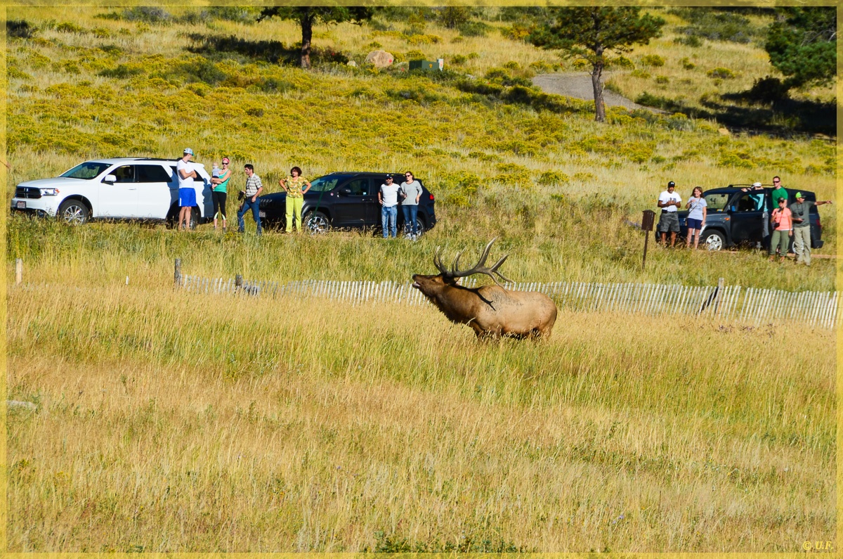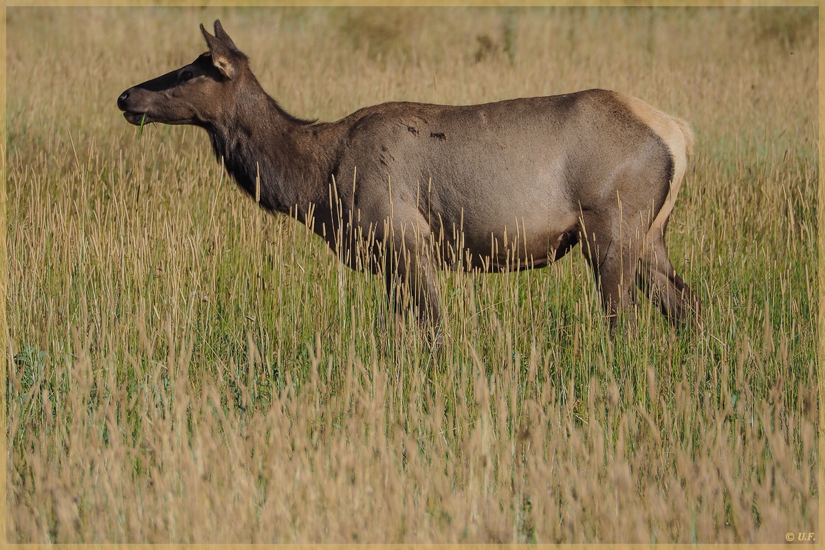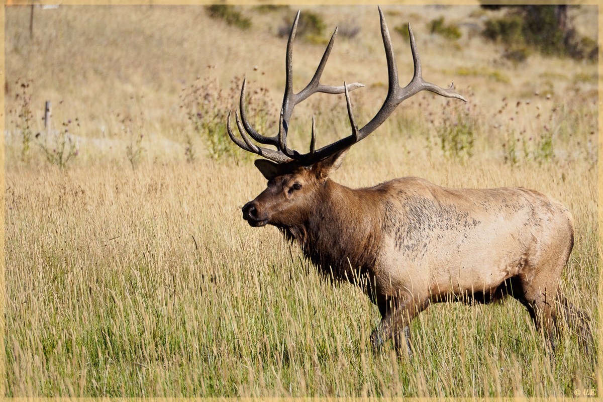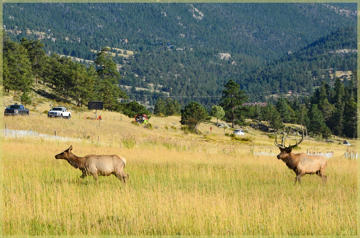 Später liefen wir dann nochmal vom CG aus los, in der Hoffnung, am ca. 2km entfernten Elk-Viewing-Point schöne Tierbeobachtungen zu machen. Einige Wapiti-Hirsche waren auch da, allerdings nicht so viele wie am Vortag (hatten wir bei unserer Anreise gesehen, konnten aber leider nicht anhalten). Schon verrückt anzusehen, wie all die Touris mit ihren Autos die Straßenränder zuparken, um die Elks zu beobachten. Es waren auch einige Rancher vor Ort, die darauf achteten, dass die Leute mit ihren Kameras nicht auf der Straße standen und die Autos nicht kreuz und quer halten. Wir schossen auch einige Bilder und gingen irgendwann zum CG zurück.
