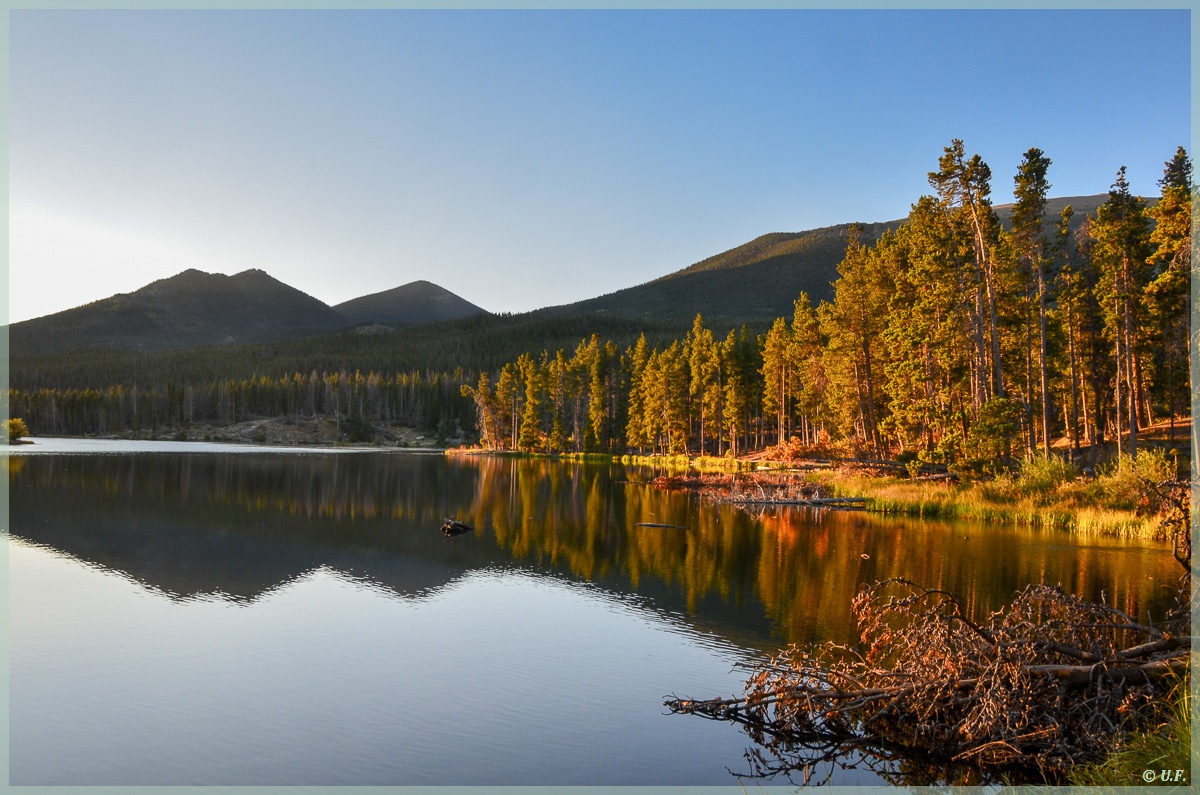 Am Sprague Lake angekommen, müssen wir leider feststellen, dass es hier zwar sehr viele Parkplätze gibt, aber leider keine für RV’s. frown Zu dieser frühen Zeit (es ist noch vor 7 Uhr) ist aber fast alles frei und wir stellen uns auf einige PKW-Plätze. Jetzt geht’s erstmal zum See und wir genießen den tollen Anblick – die Sonne ist mittlerweile aufgegangen…