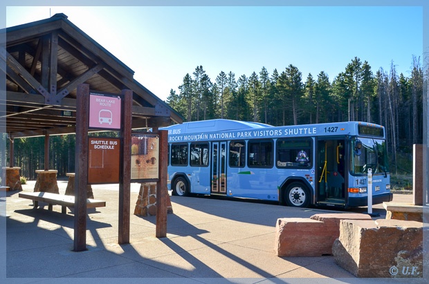 Da wir hier nicht stehenbleiben können,  geht’s nach einigen Fotos zurück zum Park&Ride-Parkplatz. Hier ist es noch überschaubar leer und auch die ca. 10 RV-Parkplätze sind noch alle frei. Jetzt wird erstmal gefrühstückt. Anschließend nehmen wir den „Bear-Lake-Shuttle“ (das ist eine von 3 Buslinien im Park und verkehrt alle 10-15 Minuten) zum Bear Lake.