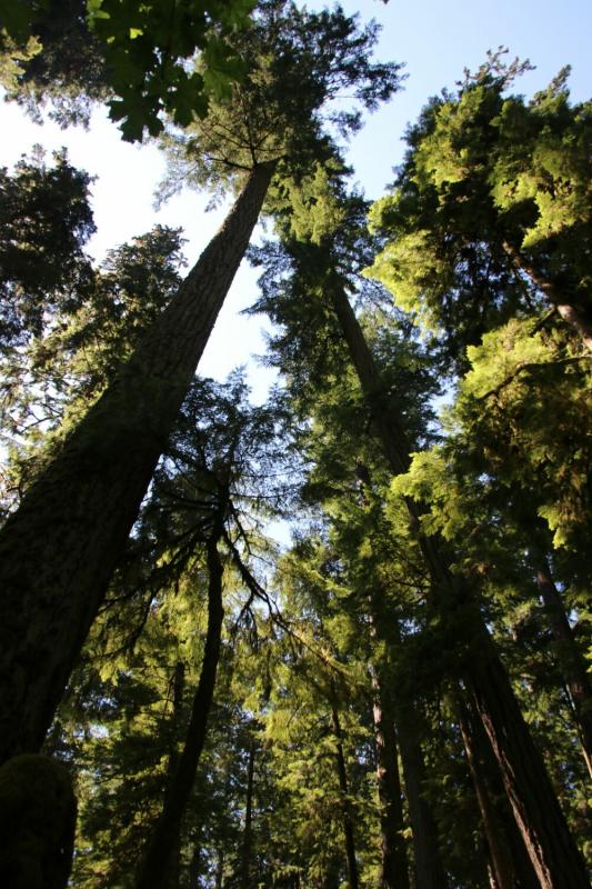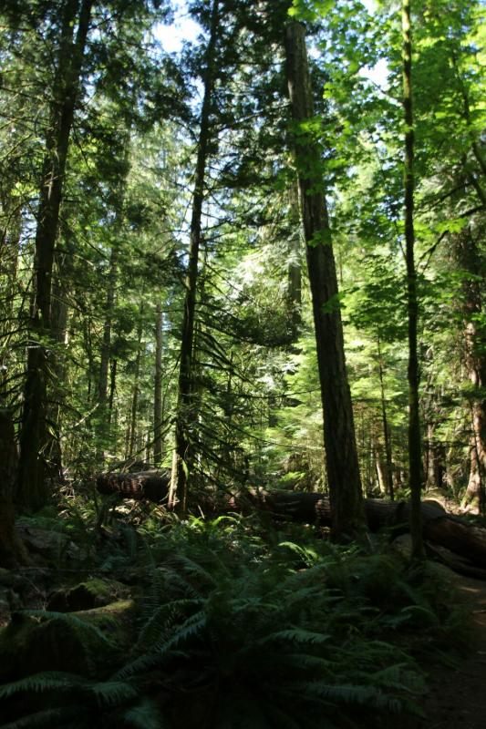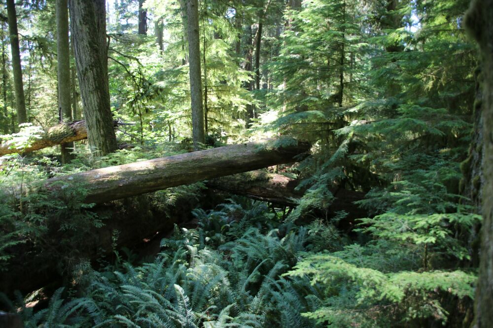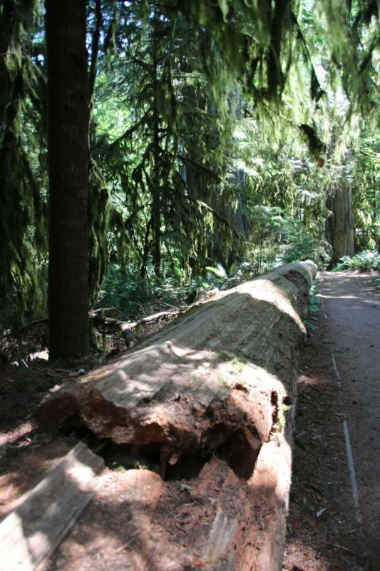 Der nächste Stopp war an der Cathedral Grove. Hier war ein regelrechtes Parkplatzchaos – da in absehbarer Zeit keine Aussicht auf einen regulären Parkplatz bestand, stellten wir unser WoMo in die Reihe der anderen am Straßenrand parkenden Fahrzeuge. Wir liefen dann die beiden kurzen Trails links und rechts der Straße durch den malerischen Wald mit Douglas Firs und Western Redcedars, teilweise schon einige hundert Jahre alt. Da wurden Erinnerungen an die Redwoods auf der letzten Tour wach. Es war glücklicher Weise nicht ganz so voll auf dem Weg, wie die vielen Fahrzeuge vermuten ließen.