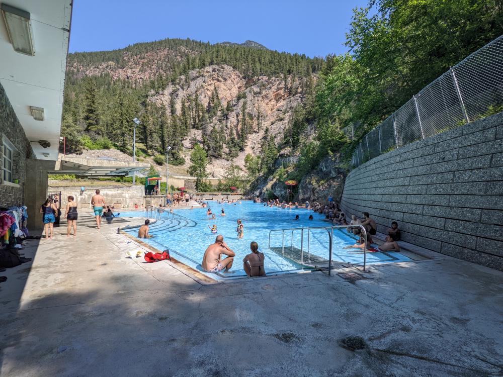 Ein Besuch nach einem Tag mit ein paar kurzen Wanderungen (Marble Canyon, Paint Pots) lohnt sich, es gibt ein großes Thermalbecken und auch ein 25m-Schwimmbecken mit Normaltemperatur, das ganze in toller Kulisse